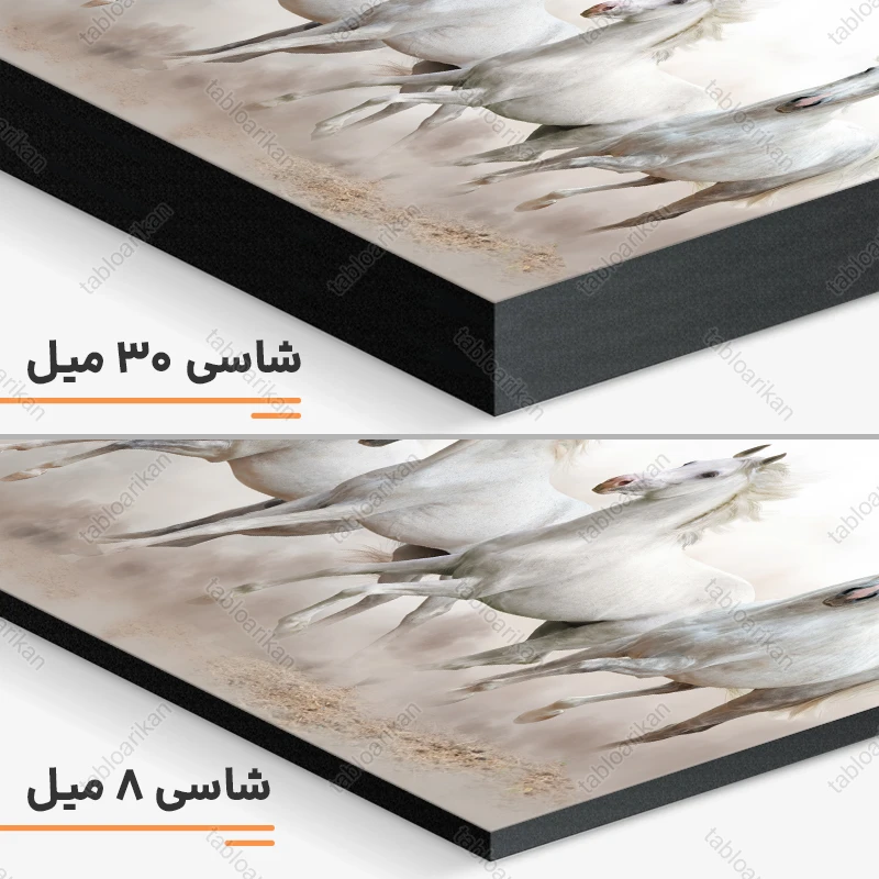 • پهنای قاب ها از ۲ سانتی‌متر تا ۵ سانتی‌متر و با شیشه فلوت درجه یک ارائه میشود