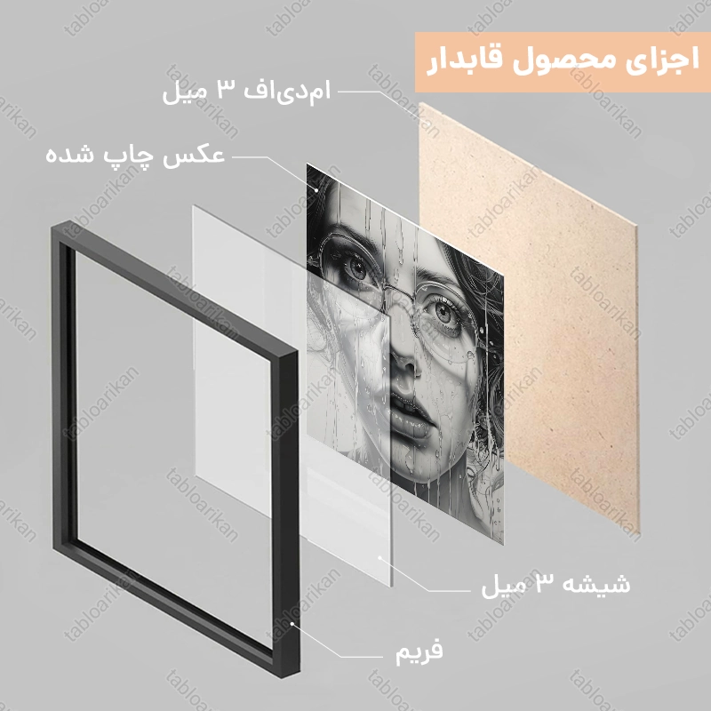 • سفارش قاب به صورت PVC، قاب چوبی و شاسی امکان‌پذیر است