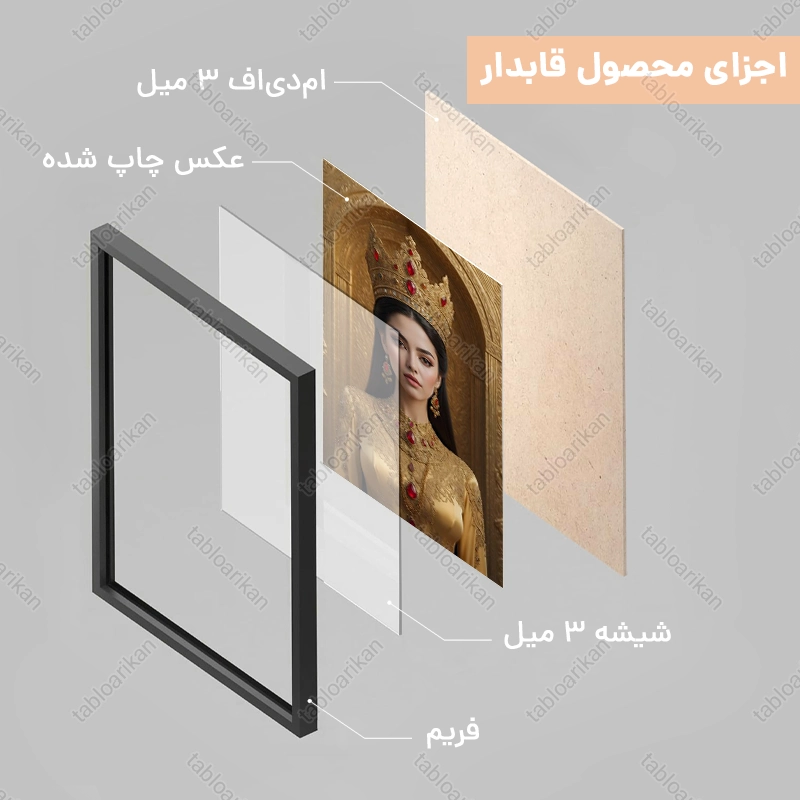 • سفارش قاب به صورت PVC، قاب چوبی و شاسی امکان‌پذیر است